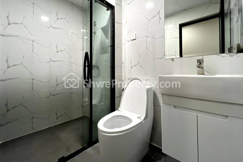 ► M Suite Residence အခန်းတွေမှာလည်း Partition, Lighting, Tiles, Parquet, Shower set, Toilet, Basin,