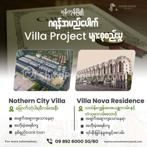 Property Name : ရန်ကုန်မြို့နယ်ရှိဂရန်အမည်ပေါက်Villa Projectများ/Land Only For Sales in Yangon/09892600050,09892600060