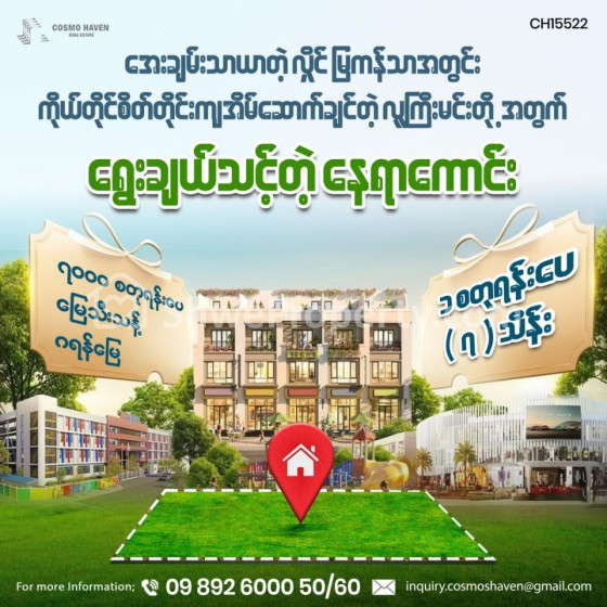 📐 မြေဧရိယာကျယ်ဝန်းပြီး ✨ ပိုင်ဆိုင်မှုလည်းခိုင်မာမှုရှိတဲ့ ဒီနေရာကောင်းလေးကို လက်မလွှတ်ရလေအောင် အခုဘဲ ဝယ်ယူနိုင်ဖို့ ညီမတို့ Cosmo Haven Estate ကို ဆက်သွယ်လိုက်တော့နော် 📞📞