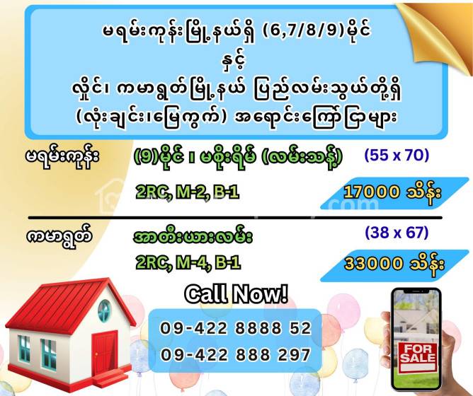 Property Name : မရမ်းကုန်းမြို့နယ်မြို့နယ်ရှိ (6,7/8/9)မိုင်နှင့် လှိုင်၊ ကမာရွတ်မြို့နယ်တို့ရှိ ပြည်လမ်းသွယ်များရှိ နေရာကောင်းဈေးနှုန်းမှန်ကန်တဲ့ (လုံးချင်း၊မြေကွက်) အရောင်း