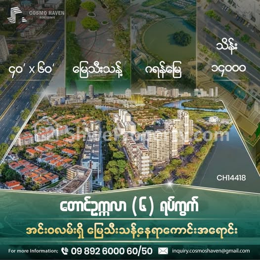 ရပ်ကွက်ကောင်း လူနေသန့်ပြီး🌴 သွားလာရလွယ်ကူတဲ့နေရာမှာရှိတဲ့ ဒီမြေကွက်လေးဟာဆိုရင် 💢ရင်းနှီးမြှုပ်နှံဖို့သင့်တော်ရုံသာမက မိသားစုအတူနေထိုင်ဖို့အတွက်ပါ💢 အဆင်ပြေတဲ့နေရာလေးဖြစ်တာမို့ အမြန်ဆုံးပိုင်ဆိုင်နိုင်ဖို့ ညီမတို့ Cosmo Haven Estate သို့ ဆက်သွယ်ဝယ်ယူနိုင်ပါပြီရှင်🍁