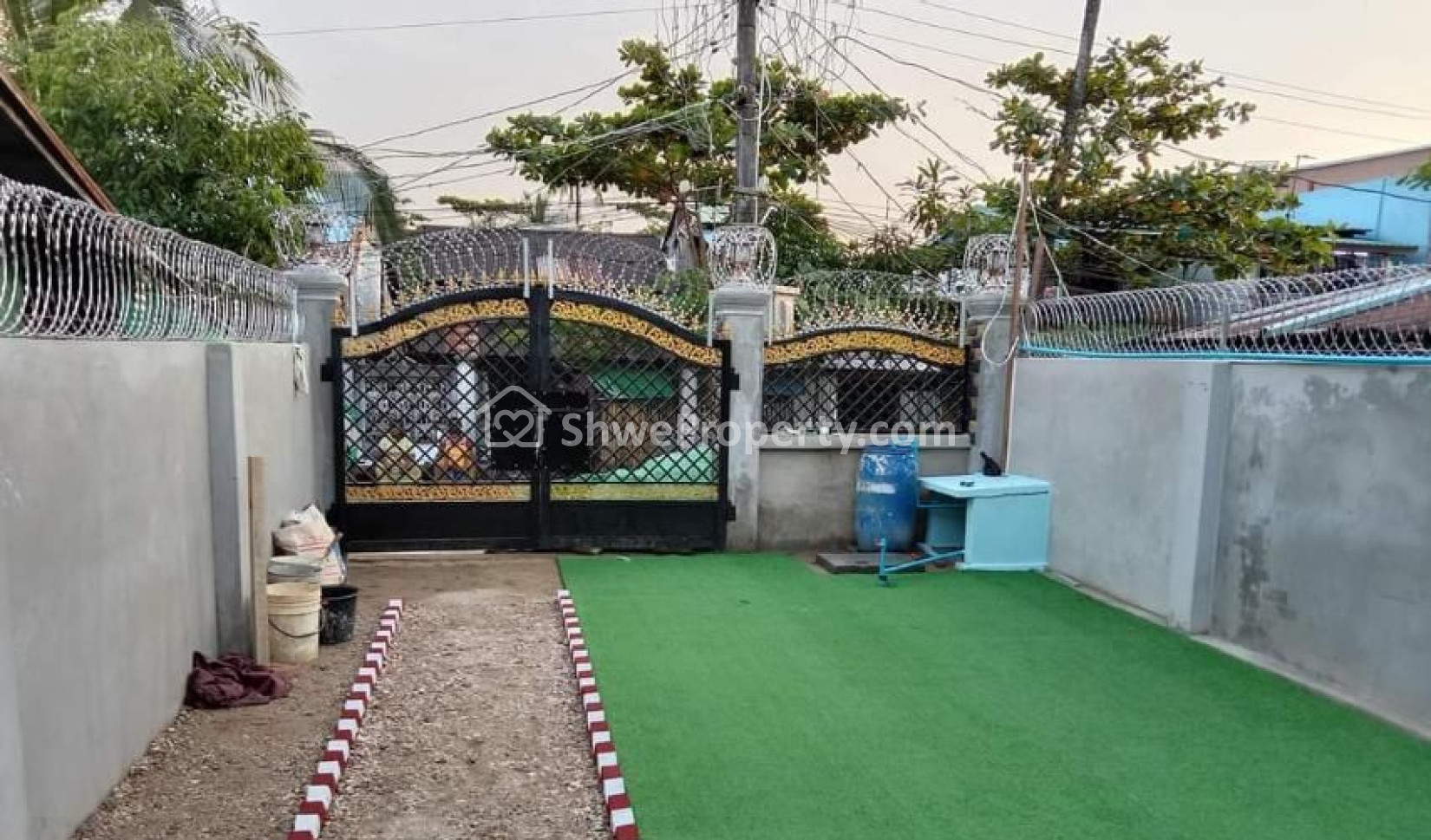 တစ်ခြံလုံးအပြည့်အုတ်တံတိုင်းခတ်ပြီး သံပန်းတံခါးတပ်ဆင်ပြီး