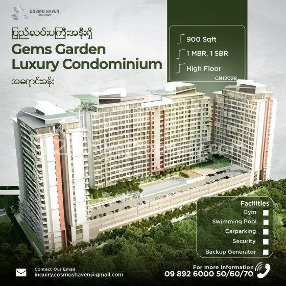 လှိုင်မြို့နယ် အင်းစိန်လမ်းမကြီးအနီးက အဆင့်မြင့် Condominium အဖြစ်နာမည်ကြီးပြီး နေထိုင်ရသက်တောင့်သက်သာရှိစေမည့် 💠 GEMs Garden Luxury condominium 💠 မှ အိပ်ခန်းနှစ်ခန်းပါသောအရောင်းခန်းလေးနဲ့ Cosmo Haven Estate မှ မိတ်ဆက်ပေးပါမယ်ခင်ဗျာ💁🏻🌟