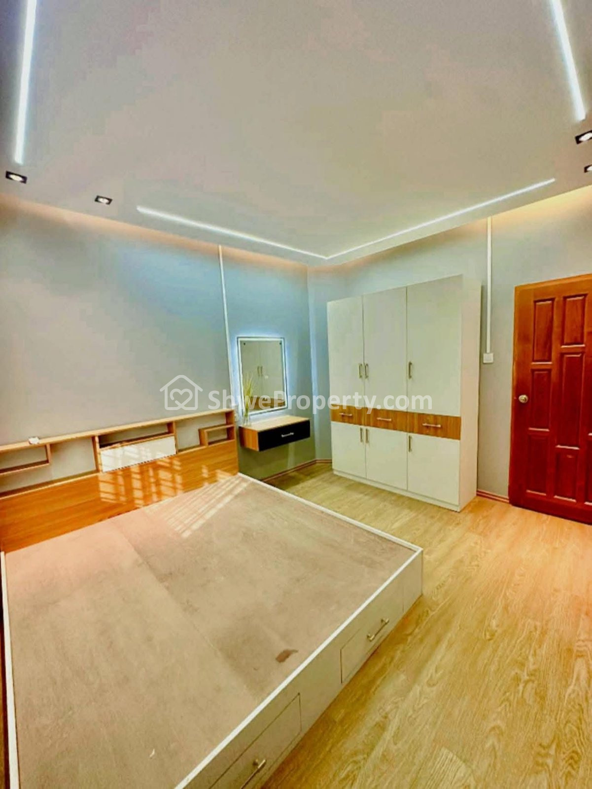 #Master_Bedroom တွင် King Size ကုတင် နံရံကပ်ဘီရို ( ၅' × ၇' ) အသစ် တစ်လုံး၊ မှန်တင်ခုံ၊ အဲကွန်း တစ်လုံးပါပါတယ်။☘️