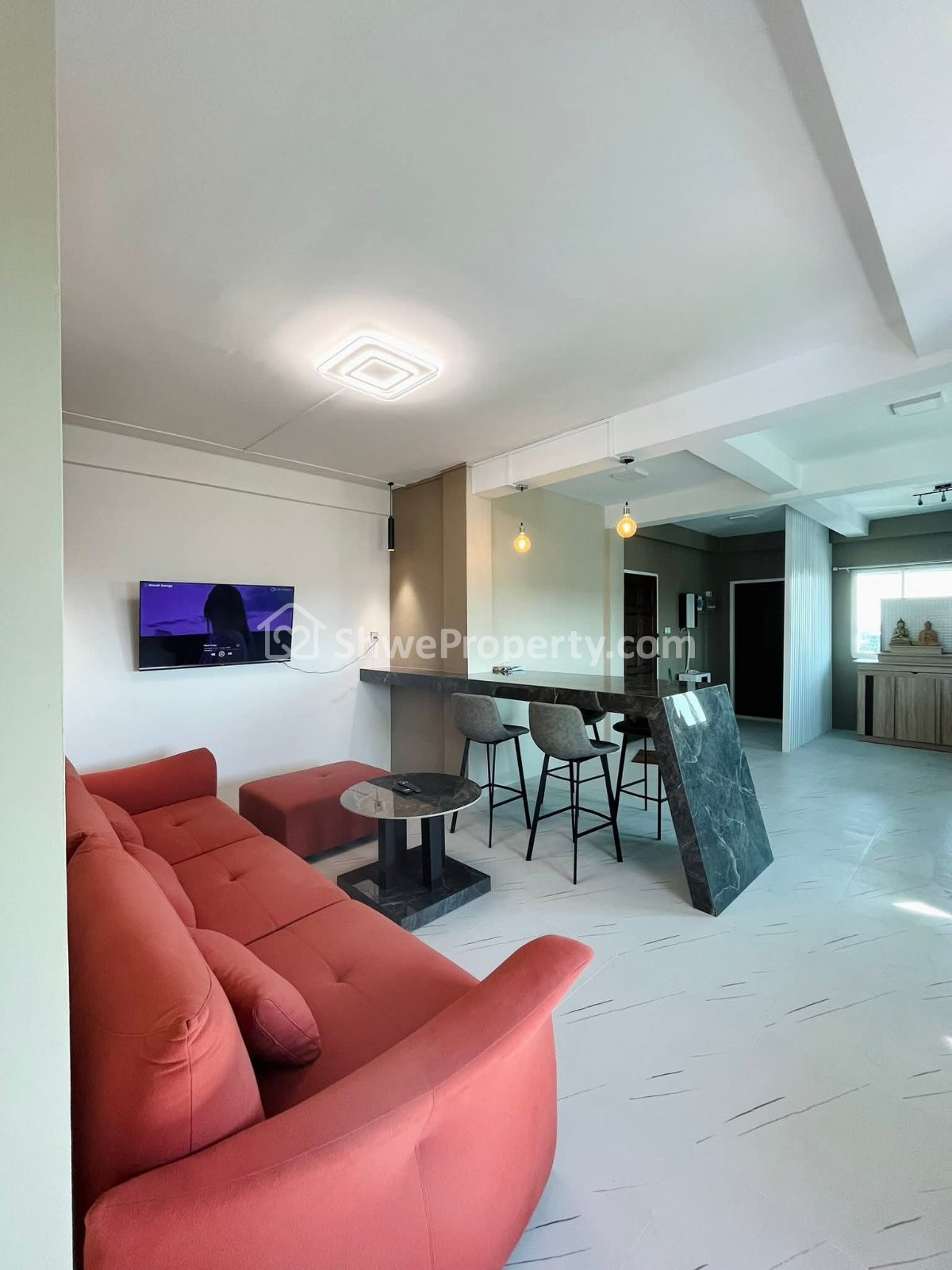 🔹ဧည့်ခန်းနဲ့ မီးဖိုခန်း ကြွေပြားခင်းထား