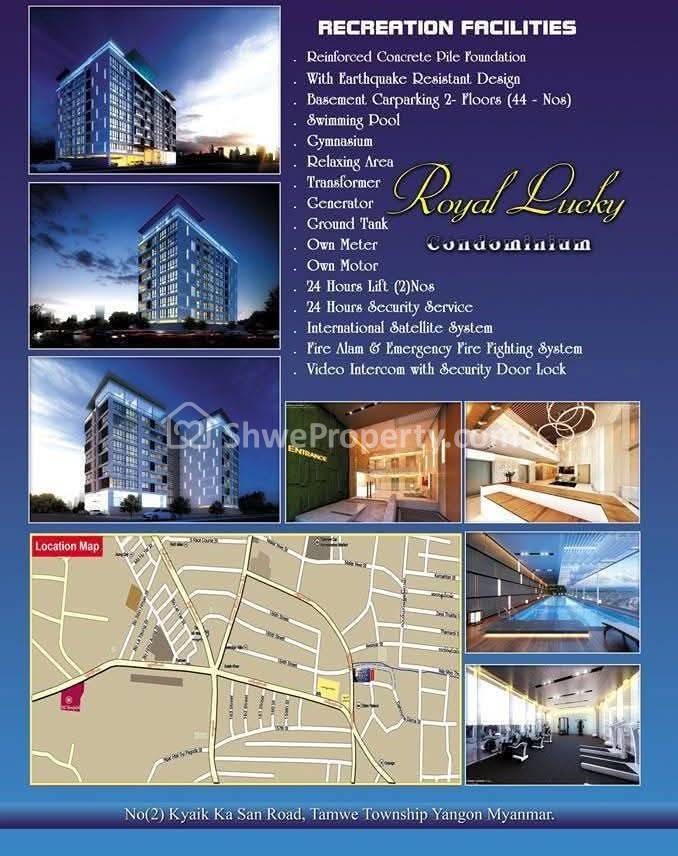 ရန်ကုန်မြို့ရဲ့ အချက်အချာကျပြီး လူစည်ကားသောနေရာဖြစ်သည့် တာမွေမြို့နယ် ကျိုက္ကဆံလမ်းမကြီးပေါ်က (၉၀%) နီးပါးဆောက်လုပ်ပြီးစီးနေပြီး မကြာခင် အခန်းအပ်တော့မှာ ဖြစ်သည့် Royal Lucky Condominium
