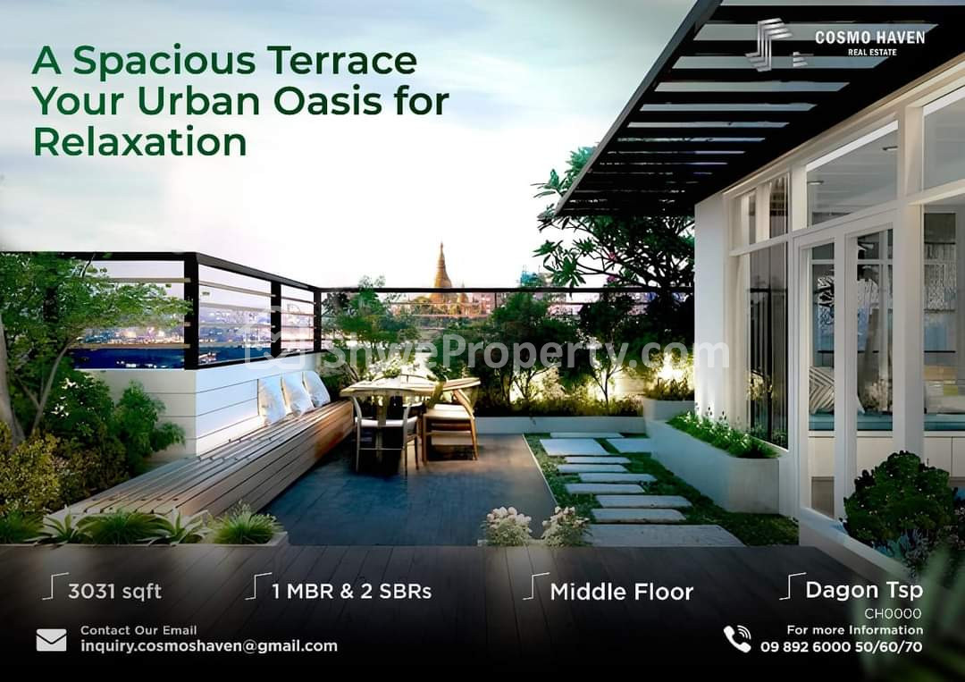 Features a large terrace even it's not a penthouse, perfect for enjoying the cool breeze and scenic views. An ideal unit for family, comes with 3 bedrooms. One of the standout features is its expansive green compound. This beautifully landscaped area is perfect for residents looking to unwind and connect with nature . Conveniently located in the middle of essential amenities such as supermarkets, restaurants, and parks . The neighborhood is known for its security , allowing you to relax and enjoy the time. Experience the best of Yangon with all family-friendly room. Meet the blend of comfort, convenience, and tranquility.