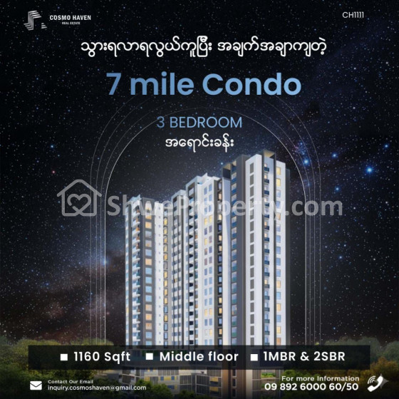 7mile condo မှ 3-Bedroom အခန်းလေးက လက်လွှတ်မခံသင့်တဲ့ အခွင့်အရေးတစ်ခုပါပဲခင်ဗျာ.......