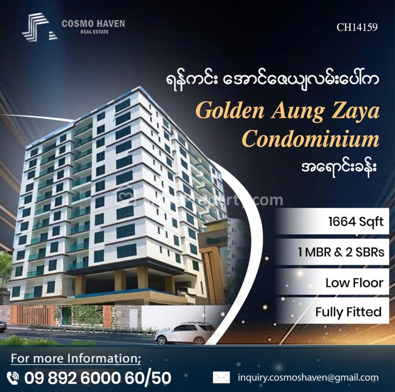 Property Name : ရန်ကင်းမြို့နယ်ရှိ Golden Aung Zaya Residence Condominium အရောင်း/Golden Aung Zaya Residence Condominium For Sales Yankin Township In Yangon/09892600050,09892600060