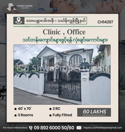 ☀️☀️☀️ 🏗️ရုံးခန်း🏠၊ Clinic 💒နှင့် သင်တန်းကျောင်းများ🏯ဖွင့်လှစ်ရန်အတွက် ရန်ကုန်မြို့ရဲ့ အချက်ချာကျတဲ့ နေရာများတွင် တည်ရှိပြီး ဝန်ထမ်းများအတွက် သွားလာရလွယ်ကူအဆင်ပြေစေတဲ့ 💸💸 သိန်း ၃၀ မှ သိန်း ၁၅၀ 💸💸အတွင်းရှိ လုံးချင်းကောင်းများကို လူကြီးမင်းတို့စိတ်ကြိုက် အချိန်ကုန်သက်သာစွာ ရွေးချယ်နိုင်ရန် Cosmo Haven မှတစုတစည်းတည်းဖော်ပြပေးလိုက်ပါတယ်ရှင့်။🎄🎄🆙️🆙️