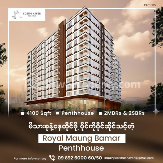 Royal Maung Bamar Condo ရဲ့အမြင့်ဆုံး မှာရှိတဲ့ ပရီမီယံ penthouse ကို ရောင်းချပေးမှာဖြစ်ပါတယ်။
