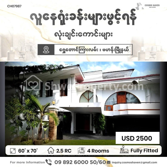 Property Name : လူနေရုံးခန်းများဖွင့်ရန်အတွက်နေရာကောင်းလုံးချင်းအိမ်အငှားများ/Landed House For Rent In Yangon/09892600050,09892600060