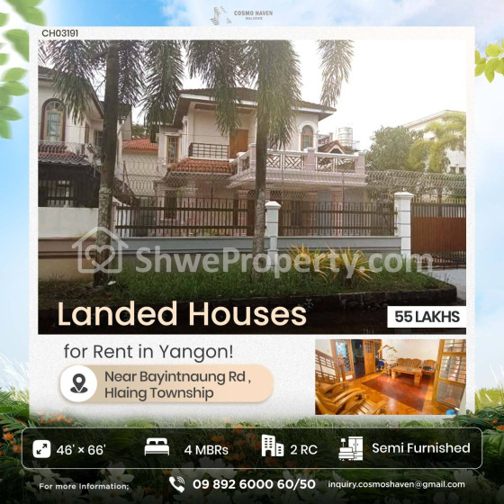 Property Name : ရန်ကုန်မြို့နယ်ရှိနေရာစုံနေရာကောင်းလုံးချင်းအိမ်ကောင်းအငှားများ/Landed House For Rent In Yangon/09892600050,09892600060