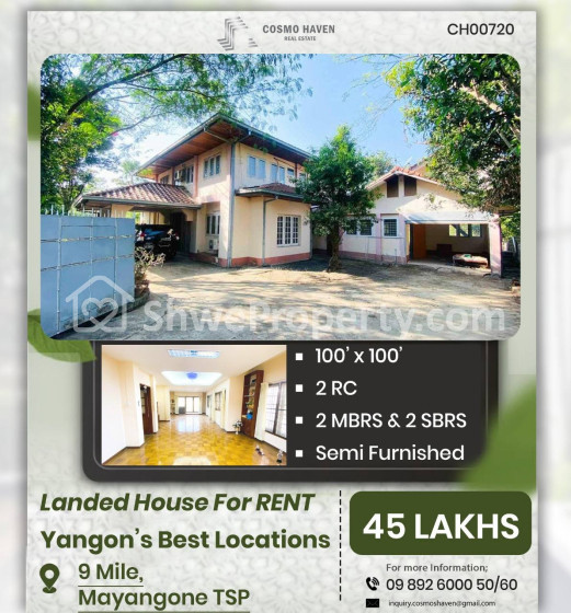 Property Name : စျေးနှုန်းသင့်တင့်Furniture အပြည့်အစုံပါရှိသောလုံးခြင်းအိမ်အငှား/Landed House for Rent Mayangone Township in Yangon