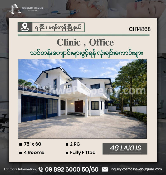 ☀️☀️☀️ 🏗️ရုံးခန်း🏠၊ Clinic 💒နှင့် သင်တန်းကျောင်းများ🏯ဖွင့်လှစ်ရန်အတွက် ရန်ကုန်မြို့ရဲ့ အချက်ချာကျတဲ့ နေရာများတွင် တည်ရှိပြီး ဝန်ထမ်းများအတွက် သွားလာရလွယ်ကူအဆင်ပြေစေတဲ့ 💸💸 သိန်း ၃၀ မှ သိန်း ၁၅၀ 💸💸အတွင်းရှိ လုံးချင်းကောင်းများကို လူကြီးမင်းတို့စိတ်ကြိုက် အချိန်ကုန်သက်သာစွာ ရွေးချယ်နိုင်ရန် Cosmo Haven မှတစုတစည်းတည်းဖော်ပြပေးလိုက်ပါတယ်ရှင့်။🎄🎄🆙️🆙️