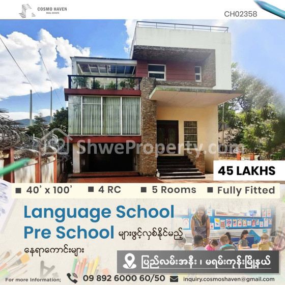 🈵🈵🈵 Language Centre,🏫Pre - School 🏨Training Centreများကို ရန်ကုန်မြိုရှိ မြိုနယ်စုံနေရာကောင်းများတွင် ဖွင့်လှစ်ချင်တဲ့လူကြီးမင်းများအတွက် သွားလာရလွယ်ကူပြီး၊ လူစည်ကားသည့် နေရာများတွင်ဖြစ်လို လုပ်ငန်းရှင်လူကြီးမင်းတို့ အချိန်မကုန်ဘဲရွှေးချယ်နိုင်စေရန် Cosmo Haven မှတစုတစည်းတည်းဖော်ပြပေးလိုက်ပါတယ်ခင်ဗျာ။