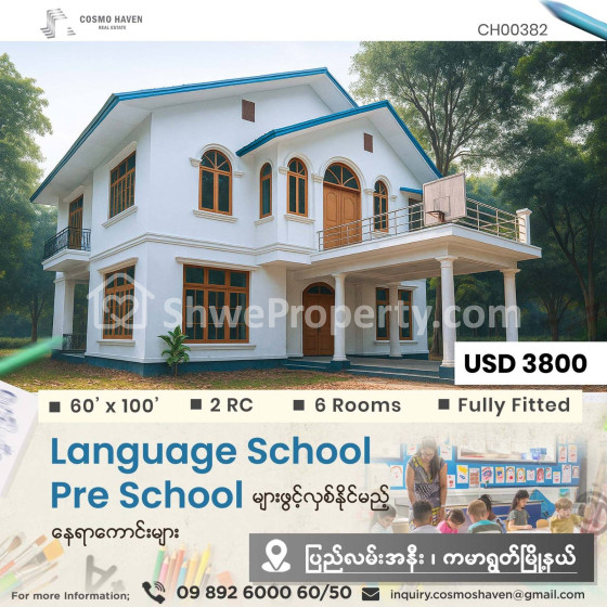 🈵🈵🈵 Language Centre,🏫Pre - School 🏨Training Centreများကို ရန်ကုန်မြိုရှိ မြိုနယ်စုံနေရာကောင်းများတွင် ဖွင့်လှစ်ချင်တဲ့လူကြီးမင်းများအတွက် သွားလာရလွယ်ကူပြီး၊ လူစည်ကားသည့် နေရာများတွင်ဖြစ်လို လုပ်ငန်းရှင်လူကြီးမင်းတို့ အချိန်မကုန်ဘဲရွှေးချယ်နိုင်စေရန် Cosmo Haven မှတစုတစည်းတည်းဖော်ပြပေးလိုက်ပါတယ်ခင်ဗျာ။