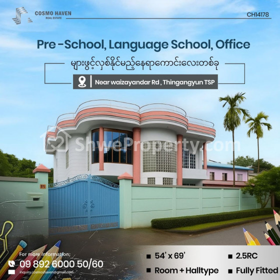 Property Name : Pre -School, Language School,Office များဖွင့်နိုင်မည့် အိမ်ကောင်းလေးတစ်ခု/Office for Rent Thingangyun Township in Yangon