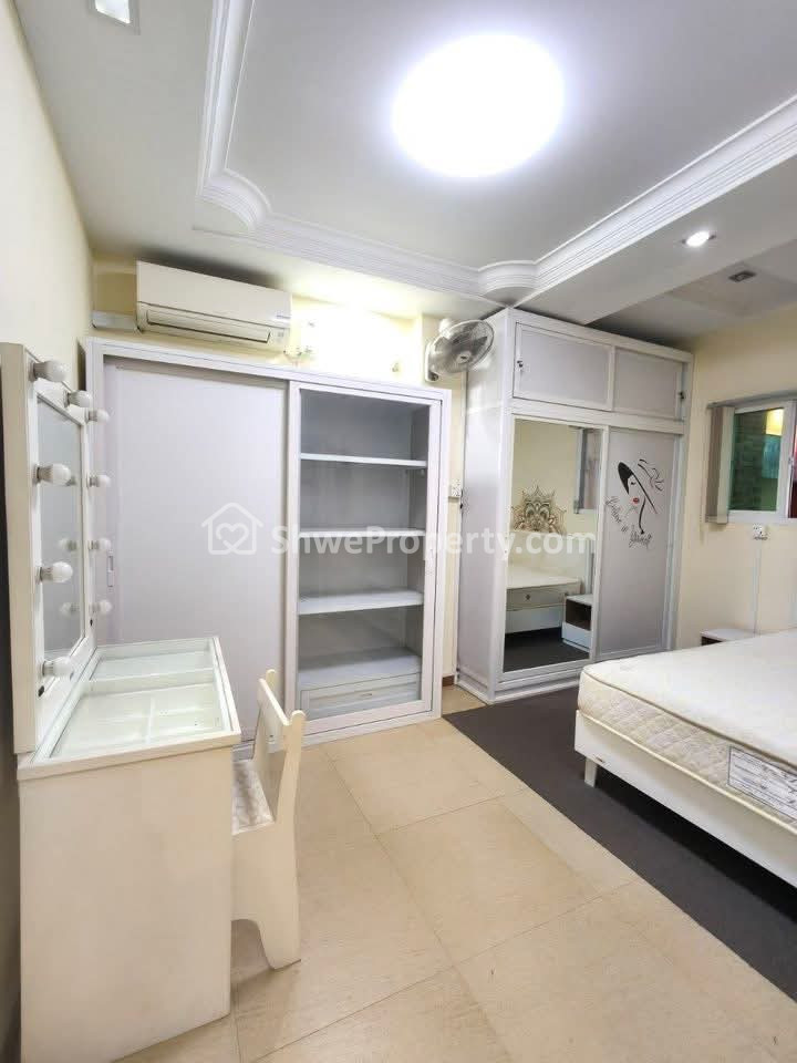 Aircon x2 (Mitsubishi) ,sofa set x1, tv & stand, big wardrobe x4, dining table set x1 , အလှပြင်မှန်တင်ခုံx1 , washing machine x1 , fridge x1, kitchen cabinet x1 ..