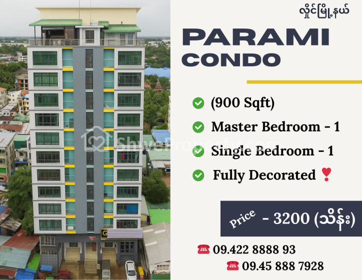 Property Name : လှိုင်မြို့နယ် ၊ ပါရမီကွန်ဒို ၊ (900 Sqft) , For Sale