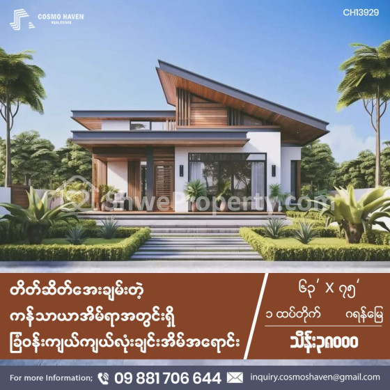 တိတ်ဆိတ်အေးချမ်းတဲ့ ကန်သာယာအိမ်ရာအတွင်းရှိ ခြံဝန်းကျယ်ကျယ် လုံးချင်းအိမ်အရောင်း