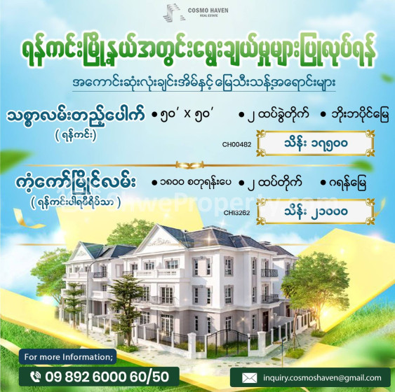 Property Name : ရန်ကင်းမြို့နယ်ရှိ အကောင်းဆုံးလုံးချင်းအိမ်နှင့်မြေသီးသန့်အရောင်းများ/Landed House And Land Only For Sales In Yangon/09892600050,09892600060