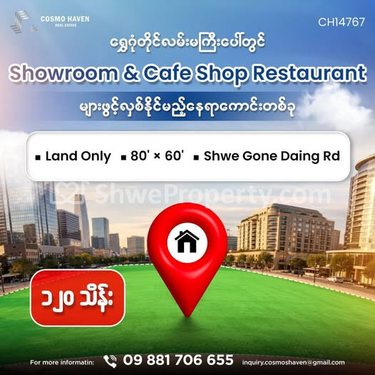 အိမ်ခြံမြေ အမည် : ရွှေဂုံတိုင်လမ်းမပေါ်တွင် Restaurantများ၊Coffee Shop များဖွင့်လှစ်ရန်နေရာကောင်းတခု/Land Only for Rent Bahan Township in Yangon/09892600050,09892600060