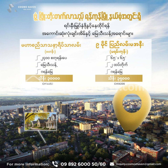 🏡 📌🏘️🌟လူကြီးမင်းတို့အတွက်ရန်ကုန်မြို့မှာ နေရာလဲကောင်းမယ် ပိုင်ဆိုင်မှုလဲအခိုင်အမာရှိပြီး အနာဂတ်အတွက်လဲတန်ဖိုးမြင့်တက်နိုင်မည့် မြို့နယ်စုံရှိ လုံးချင်းအိမ်နှင့် မြေနေရာအရောင်းများကို ကျွန်မတို့ Cosmo Haven Real Estate မှ တစုတစည်းထဲရွေးချယ်ဖော်ပြလိုက်ပါတယ်ရှင်🌟