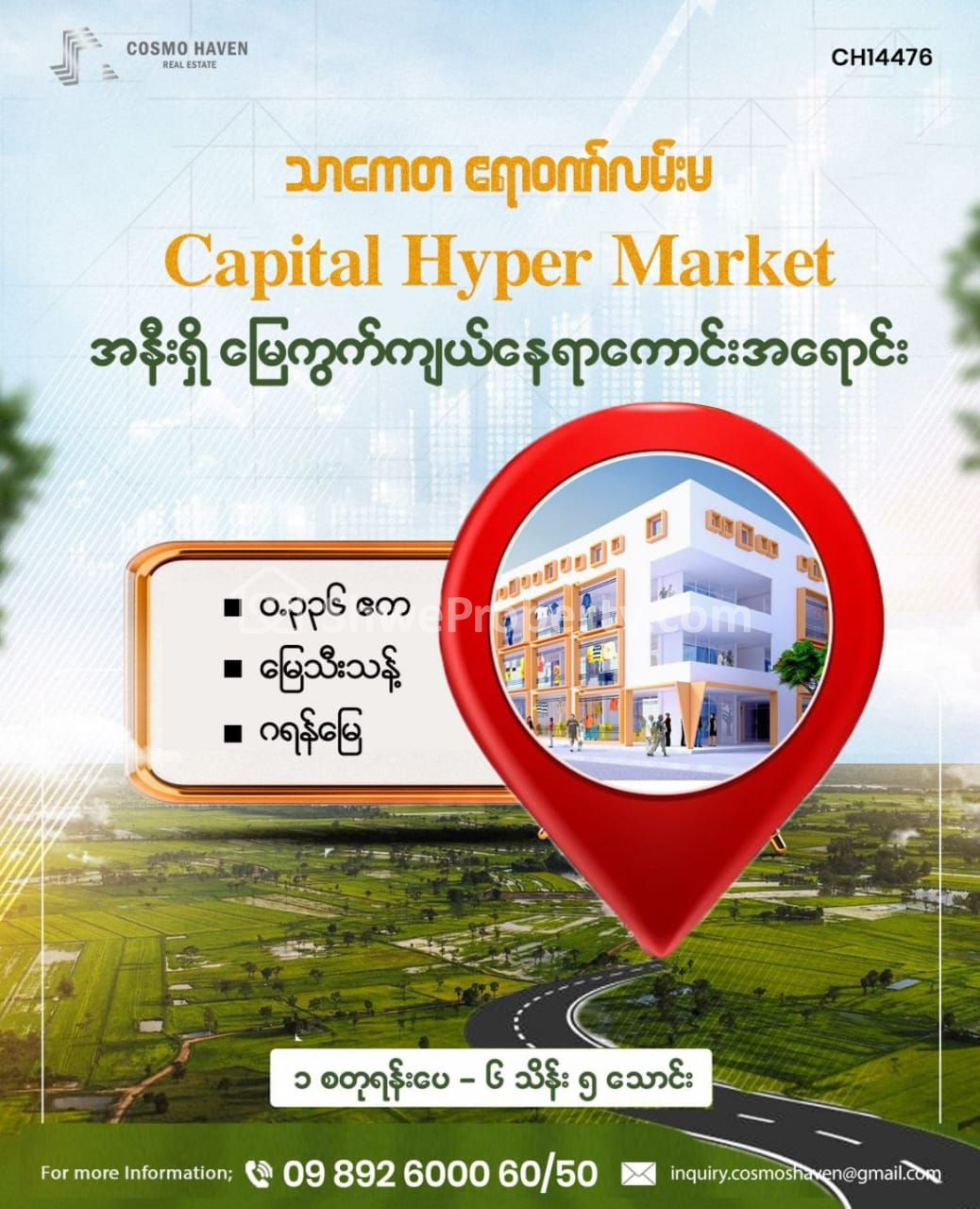 🏘️သာကေတမြို့နယ်ရဲ့ အဓိကမိန်းလမ်းမကြီးတစ်ခုဖြစ်သည့် ဧရာဝဏ်လမ်းမအနီးဆုံးတွင်တည်ရှိသောကြောင့် မြို့တွင်းမြို့ပြင် အလွယ်တကူသွားလာနိုင်ပြီး မိသားစုနှင့်အတူအေးချမ်းစွာနေထိုင်လိုသည်ဖြစ်စေ လူကြီးမင်းတို့ရဲ့စီးပွားရေးလုပ်ငန်းအတွက် ရင်းနှီးမြုပ်နှံလိုသည်ဖြစ်စေ အထူးသင့်တော်သည့်အပြင် နောင်အနာဂတ်တွင်လည်း သေချာပေါက် မြေတန်ဖိုးတက်လာနိုင်မည့် မြေနေရာကောင်းလေးတစ်ခုကို ၁ စတုရန်းပေ ၆ သိန်းနှုန်းဖြင့် ပိုင်ဆိုင်နိုင်မည့် အခွင့်အရေးကို လူကြီးမင်းတို့ လက်မလွှတ်ရလေအောင် ကျွန်တော်တို့ Cosmo Haven Estate သို့ အမြန်ဆုံး ဆက်သွယ်ဝယ်ယူနိုင်ပါပြီခင်ဗျာ ♦️♦️