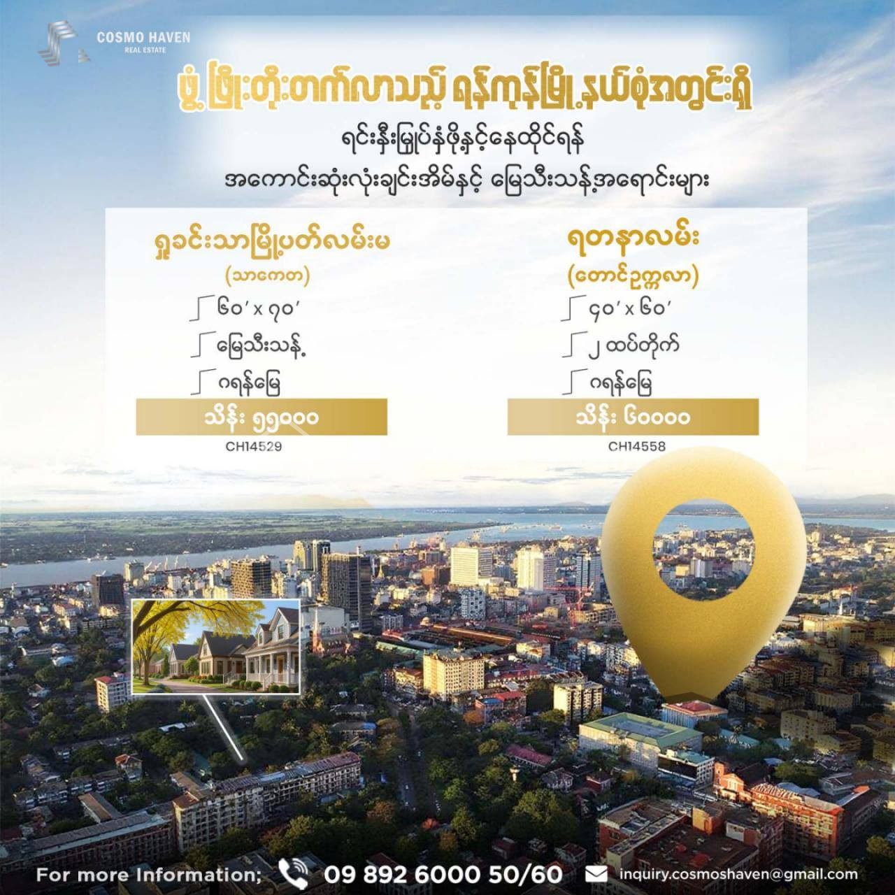 🏡 📌🏘️🌟လူကြီးမင်းတို့အတွက်ရန်ကုန်မြို့မှာ နေရာလဲကောင်းမယ် ပိုင်ဆိုင်မှုလဲအခိုင်အမာရှိပြီး အနာဂတ်အတွက်လဲတန်ဖိုးမြင့်တက်နိုင်မည့် မြို့နယ်စုံရှိ လုံးချင်းအိမ်နှင့် မြေနေရာအရောင်းများကို ကျွန်မတို့ Cosmo Haven Real Estate မှ တစုတစည်းထဲရွေးချယ်ဖော်ပြလိုက်ပါတယ်ရှင်🌟