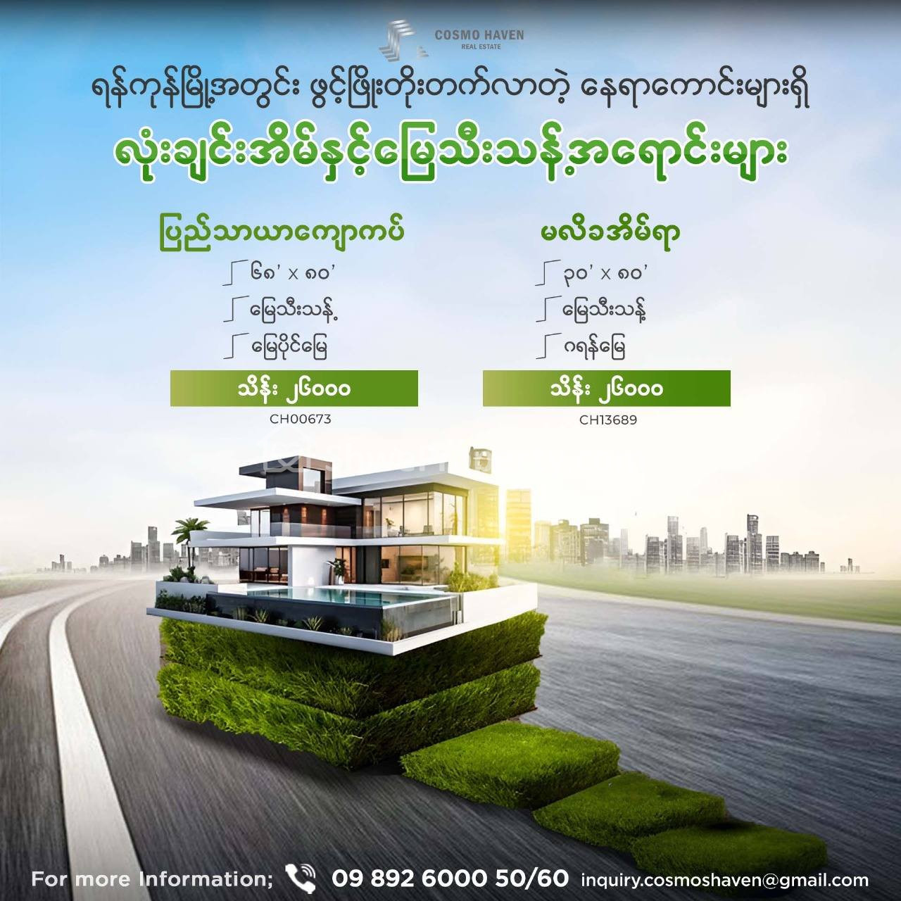 🌳🏡 လူကြီးမင်းတို့ရဲ့ စိတ်ကူးထဲကအိမ်လေးကိုအကောင်ထည်ဖော်တည်ဆောက်နိုင်ဖို့မြေကွက်ကျယ်အရောင်းအပြင်အသင့်နေထိုင်နိုင်သော Modern House , Classic House လုံးချင်းအိမ်များကို ကျွန်မတို့ Cosmo Haven Estate မှတစ်စုတစ်စည်းတည်းရွေးချယ်ဖော်ပြလိုက်ပါတယ်ရှင်