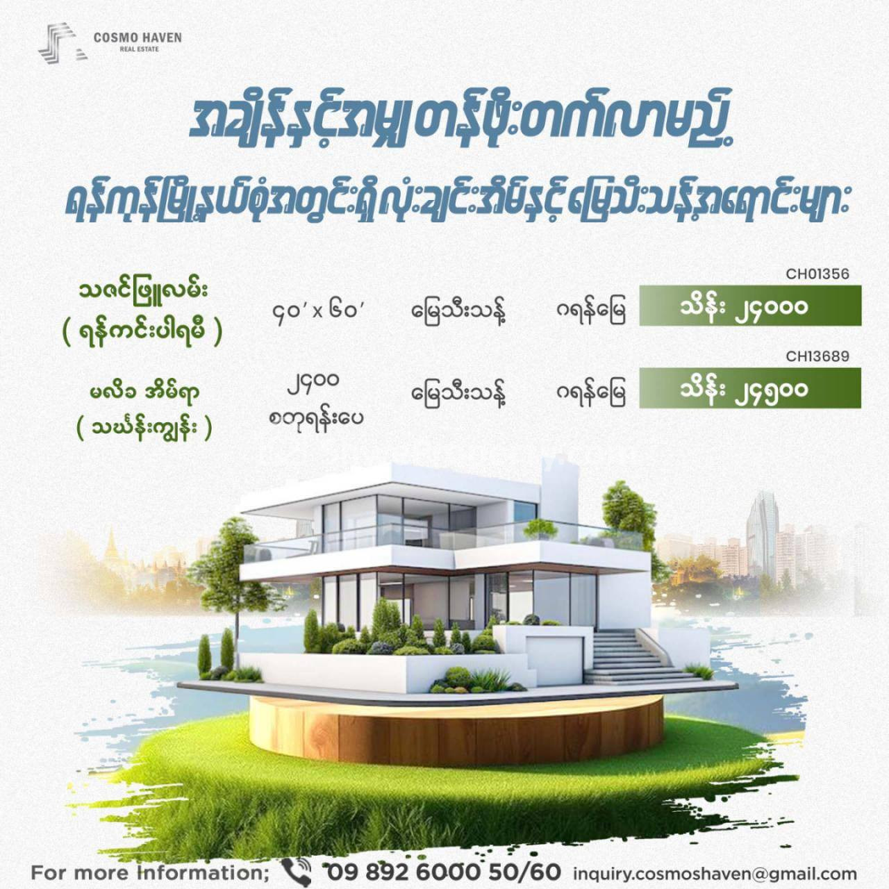 🏡 📌🏘️⏰အချိန်နှင့် အမျှ တန်ဖိုးတက်လာမည့် ရန်ကုန်မြို့နယ်စုံအတွင်းရှိ လုံးချင်းအိမ်နှင့် မြေသီးသန့်အရောင်းများကို အထူးဈေးနှုန်းဖြင့် ရွေးချယ်ဝယ်ယူနိုင်ရန် Cosmo Heaven Estate ကို အမြန်ဆုံး ဆက်သွယ် ရွေးချယ် ဝယ်ယူနိုင်ပါပြီ 📞📞