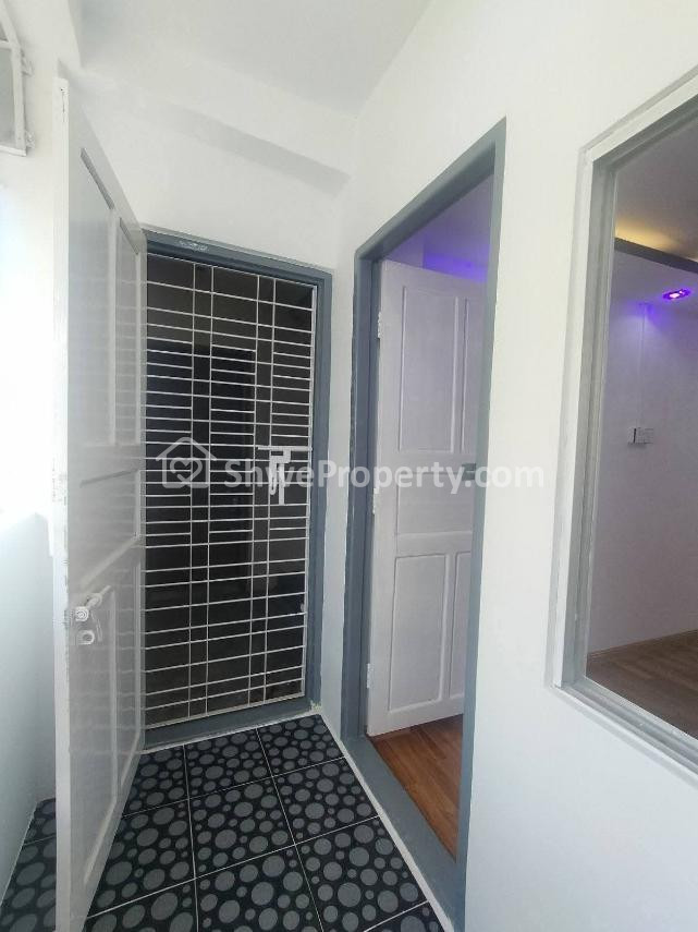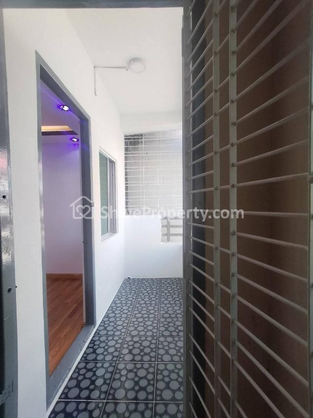#ရှေ့ဝရံမှာသံတံခါးတထပ်တပ်ထားတယ်ကြွေပြားခင်းတယ်သံဗန်းဆန်းရှိတ်ဘောက်တပ်ထား။