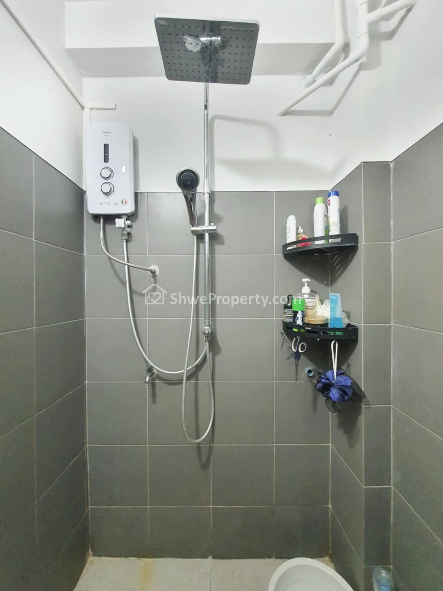 🚿 ရေတိုင်ကီကို ceiling ပေါ် တင်ထားတာမို့ ရေချိုးခန်း အိမ်သာ ကျယ်ပါတယ်။