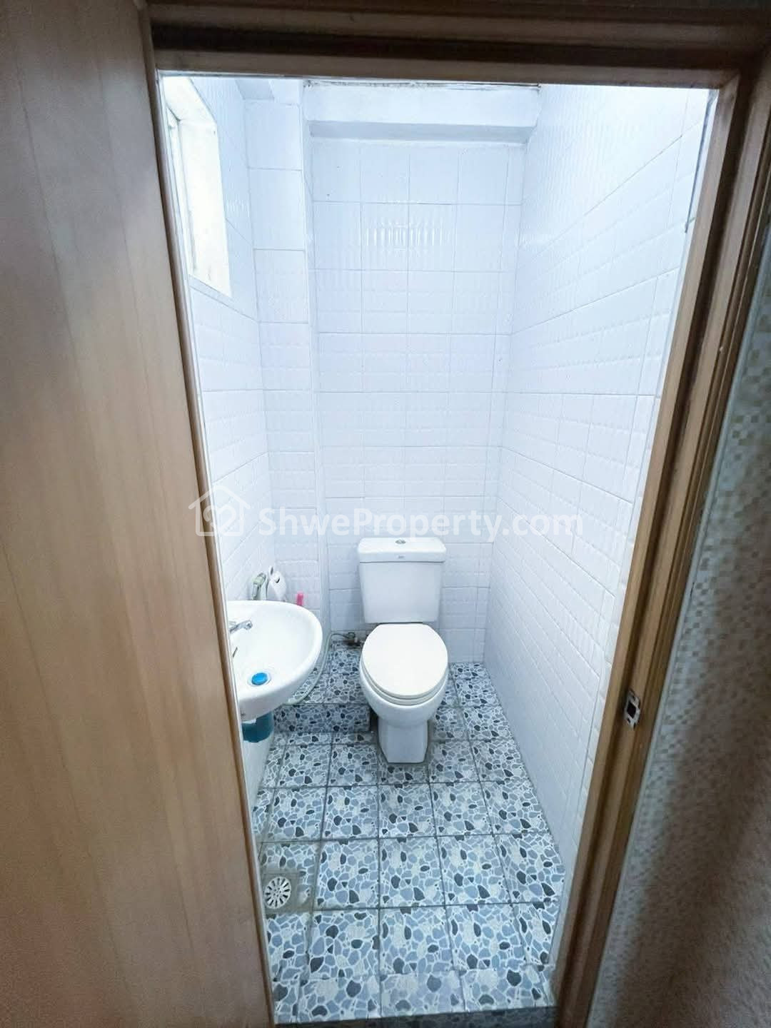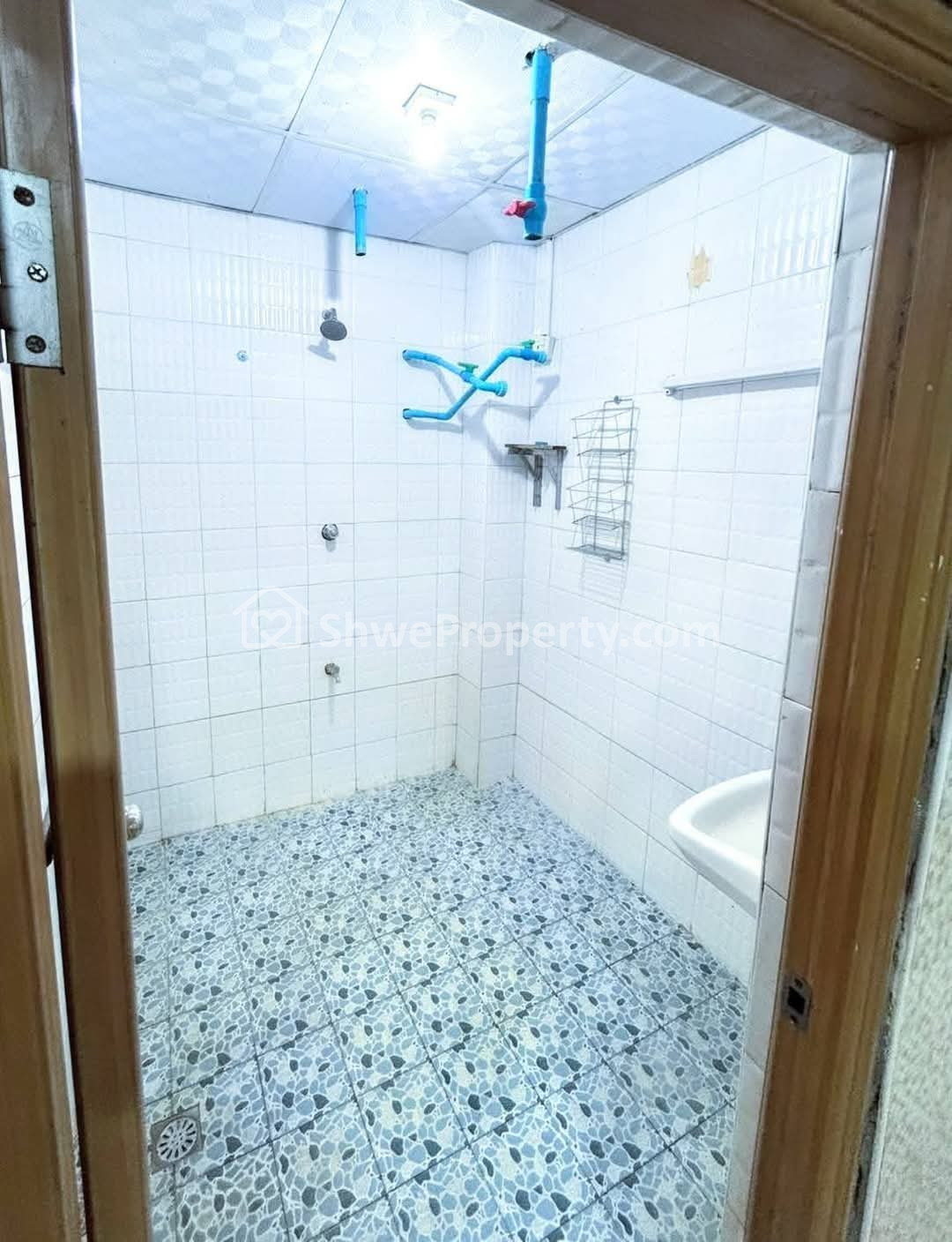 ရေချိုးခန်းကြွေဘေစင်နဲ့မှန်ပါ၊ ရေ Tank ပါရှိပြီး၊ အိမ်သာ ကြွေလက်ဆေးဘေစင်ပါရှိ