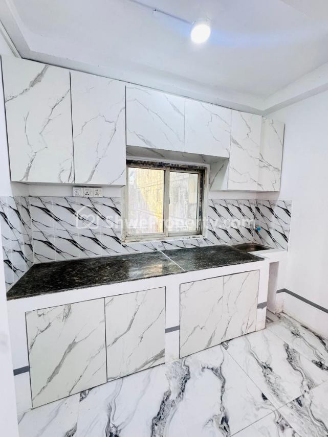 ✔️ မီးဖိုခန်း – ၂’ ကြွေပြားအသစ်စက်စက်ကပ်ထားပြီး| Cabinets with Blockboard တပ်ဆင် သန့်ရှင်းပြင်ဆင်ပြီး