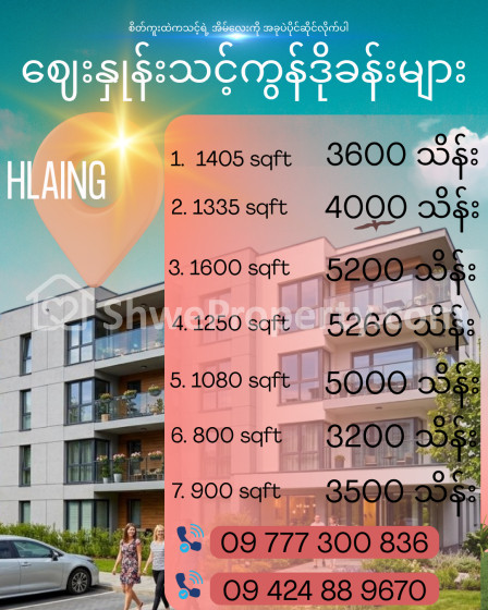 အိမ်ခြံမြေ အမည် : လှိုင်မြို့နယ်တွင်း ဈေးနှုန်းသင့် ကွန်ဒိုအရောင်းခန်းများ