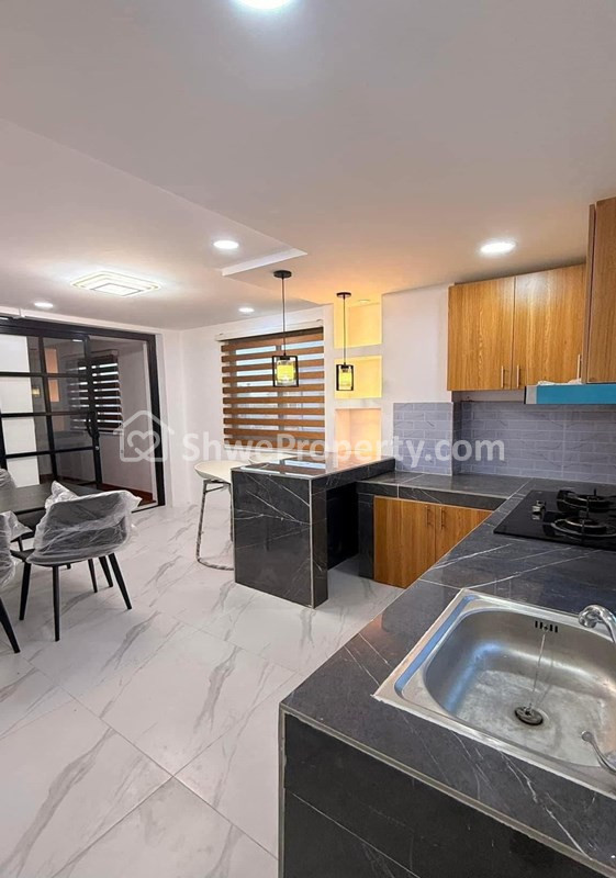 💠 kitchen တွင် ဘားကောင်တာ/ထမင်းစားပွဲနှင့်ထိုင်ခုံတစ်စုံ၊ Exhaust Hood ,Cabinet ,Gas Stove တပ်ဆင်ထားပြီး။