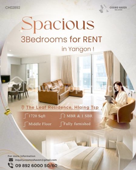 Ready to live 3 Bedrooms Condominium for RENT @Hlaing Tsp @The Leaf Condominium, Yangon 📍💯💯
