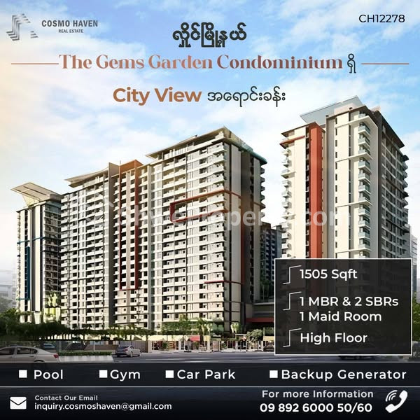 အိမ်ခြံမြေ အမည် : လှိုင်မြို့နယ် The Gems Garden Condominium ရှိ City view အရောင်းခန်း / The Gems Garden Condominium for Sales Hlaing Township in Yangon