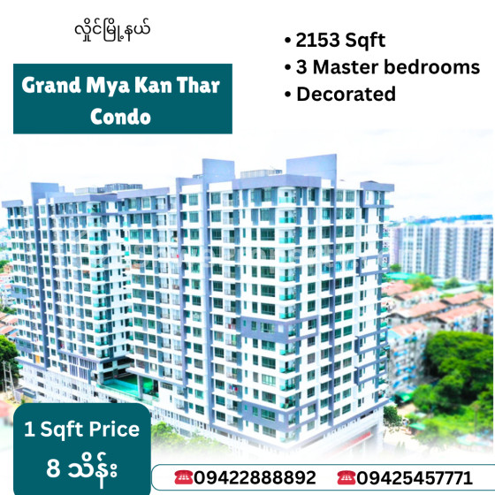 အိမ်ခြံမြေ အမည် : လှိုင်မြို့နယ် ၊ Grand Mya Kan Thar Condo (2153 Sqft)For Sale