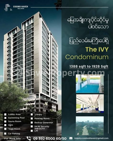 ရန်ကုန်မြို့ရဲ့ အချက်အချာကျတဲ့ ၈ မိုင်၊ ပြည်လမ်းမကြီးပေါ်မှာ တည်ရှိတဲ့ The IVY Condominium ရဲ့ အဆင့်မြင့် လူနေမှုဘဝကို ပိုင်ဆိုင်လိုက်ပါရန် ဖိတ်ခေါ်ပါရစေခင်ဗျာ။ 🛣️🏙️