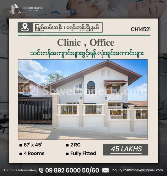 ☀️☀️☀️ 🏗️ရုံးခန်း🏠၊ Clinic 💒နှင့် သင်တန်းကျောင်းများ🏯ဖွင့်လှစ်ရန်အတွက် ရန်ကုန်မြို့ရဲ့ အချက်ချာကျတဲ့ နေရာများတွင် တည်ရှိပြီး ဝန်ထမ်းများအတွက် သွားလာရလွယ်ကူအဆင်ပြေစေတဲ့ 💸💸 သိန်း ၃၀ မှ သိန်း ၁၅၀ 💸💸အတွင်းရှိ လုံးချင်းကောင်းများကို လူကြီးမင်းတို့စိတ်ကြိုက် အချိန်ကုန်သက်သာစွာ ရွေးချယ်နိုင်ရန် Cosmo Haven မှတစုတစည်းတည်းဖော်ပြပေးလိုက်ပါတယ်ရှင့်။🎄🎄🆙️🆙️