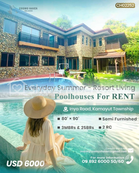 အိမ်ခြံမြေ အမည် : ရန်ကုန်မြို့နယ်ရှိမြို့နယ်စုံနေရာကောင်းPool House အငှားများ/Pool House For Rent In Yangon/09892600050,09892600060