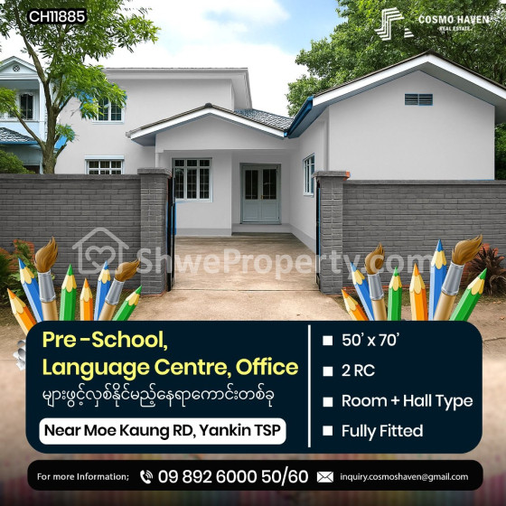 🪧ရန်ကင်းမြို့နယ်၊ မိုးကောင်းလမ်းမကြီးအနီးတွင်တည်ရှိပြီး 🏫Pre -School ၊ 🈺Language Centre ၊ 👩🏾💻Office များကို ကိုယ်ပိုင်ခြံဝန်းဖြင့် စိတ်ကြိုက်ပြင်ဆင်ဖွင့်လှစ်နိုင်ပြီး ကားပါကင်အတွက် စိတ်ပူစရာမလိုပဲသွားလာရလွယ်ကူတဲ့နေရာလေးကို လုပ်ငန်းရှင်လူကြီးမင်းတို့အတွက် Cosmo Haven Real က နေရွေးချယ်ဖော်ပြပေးလိုက်ပါတယ်ခင်ဗျာ။📚📚📚