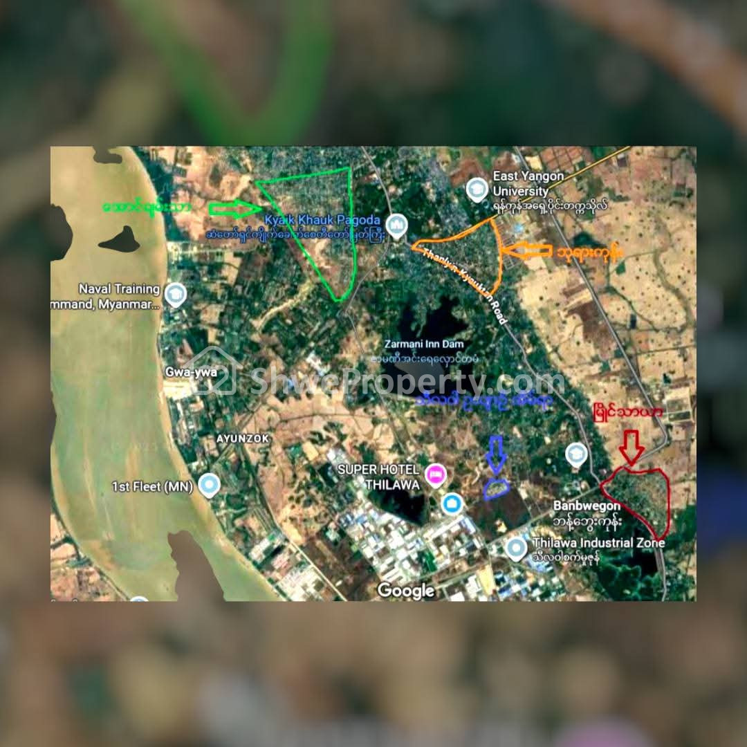 အိမ်ခြံမြေ အမည် : ရန်ကုန်တိုင်းဒေသကြီးတွင်တည်ရှိသည့် သန့်လျှင်-ကျောက်တန်းမြို့နယ် "သီလဝါ အထူးစီးပွားရေးဇုန်"ရှိ တပ်ရာကုန်း၊ နတ်စင်ကုန်း တွင်မြေကွက်ကောင်း ရောင်းပါမည်။