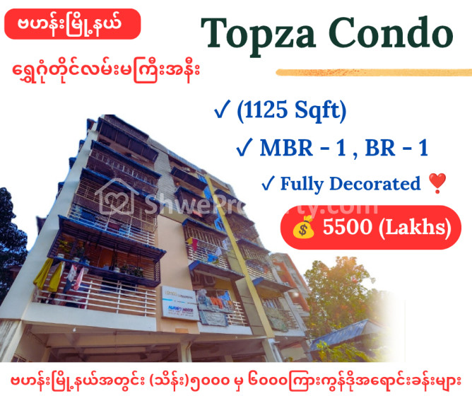 အိမ်ခြံမြေ အမည် : ဗဟန်းမြို့နယ် ၊ Topza Condo , (1125 Sqft) , For Sale