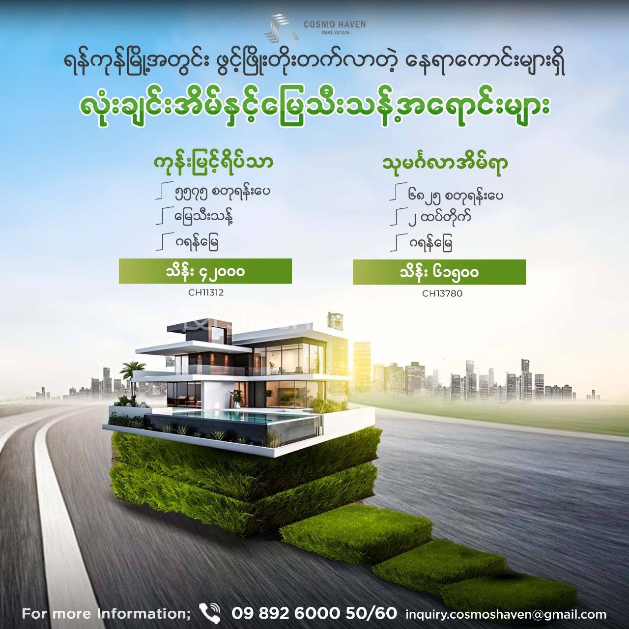 🌳🏡 လူကြီးမင်းတို့ရဲ့ စိတ်ကူးထဲကအိမ်လေးကိုအကောင်ထည်ဖော်တည်ဆောက်နိုင်ဖို့မြေကွက်ကျယ်အရောင်းအပြင်အသင့်နေထိုင်နိုင်သော Modern House , Classic House လုံးချင်းအိမ်များကို ကျွန်မတို့ Cosmo Haven Estate မှတစ်စုတစ်စည်းတည်းရွေးချယ်ဖော်ပြလိုက်ပါတယ်ရှင်
