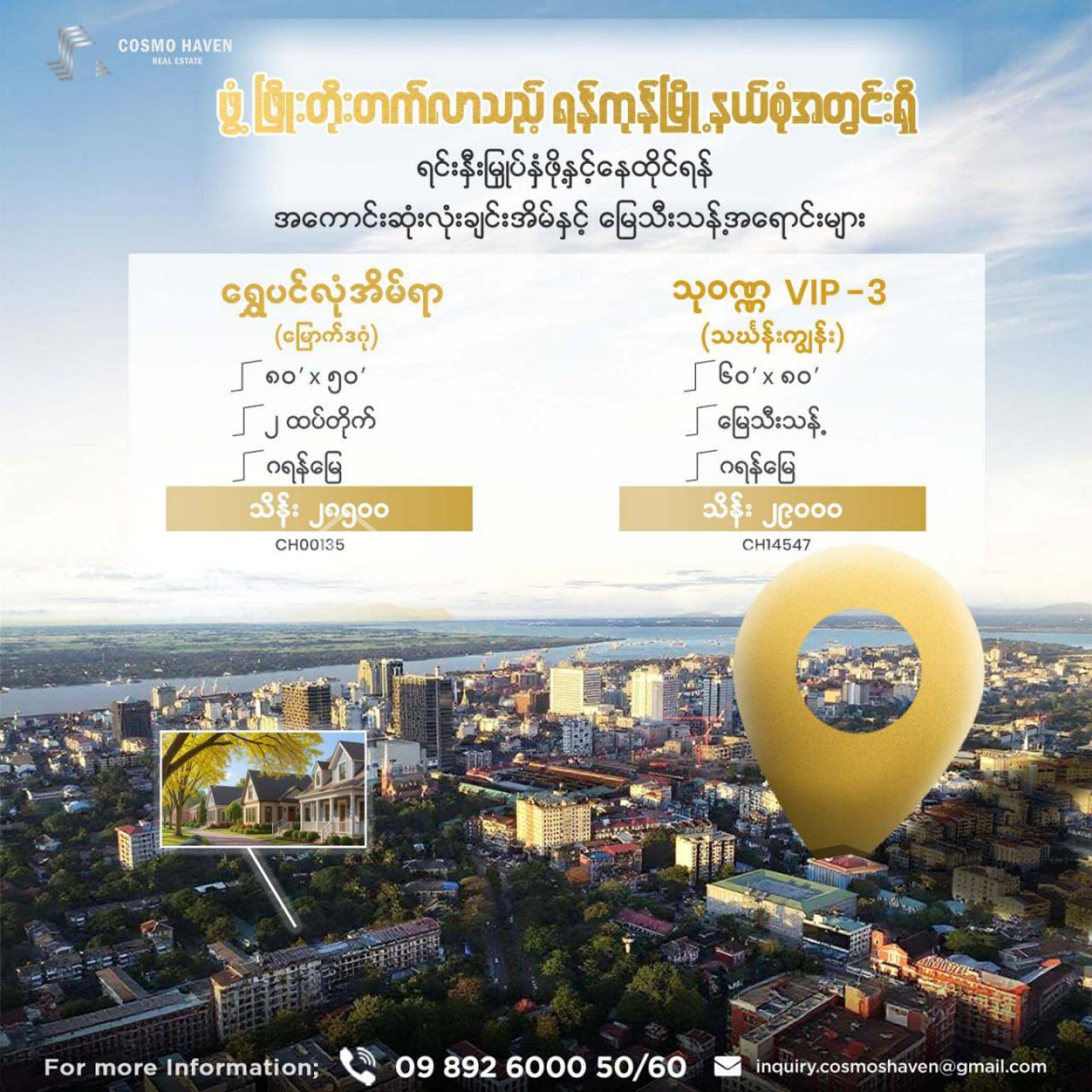 🏡 📌🏘️🌟လူကြီးမင်းတို့အတွက်ရန်ကုန်မြို့မှာ နေရာလဲကောင်းမယ် ပိုင်ဆိုင်မှုလဲအခိုင်အမာရှိပြီး အနာဂတ်အတွက်လဲတန်ဖိုးမြင့်တက်နိုင်မည့် မြို့နယ်စုံရှိ လုံးချင်းအိမ်နှင့် မြေနေရာအရောင်းများကို ကျွန်မတို့ Cosmo Haven Real Estate မှ တစုတစည်းထဲရွေးချယ်ဖော်ပြလိုက်ပါတယ်ရှင်🌟