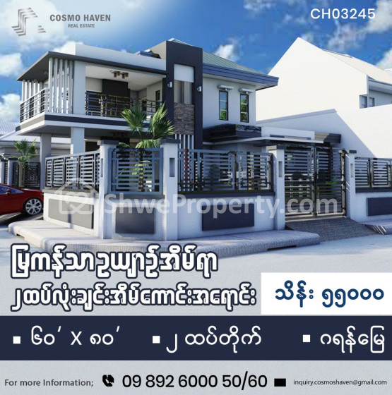 အိမ်ခြံမြေ အမည် : မြကန်သာအိမ်ရာအတွင်းရှိ၂ထပ်လုံးချင်းတိုက်အရောင်း/Landed House for Sales Hlaing Township in Yangon